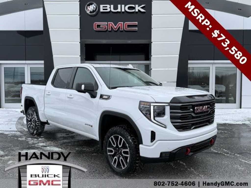 Priced below KBB Fair Purchase Price!10-Speed Automatic, 4WD, Jet Black With Kalahari Accents Leather, 120-Volt Bed Mounted Power Outlet, 120-Volt Interior Power Outlet, 2 Charge/Data USB Ports Inside Center Console, 2 Type-C Charge-Only Rear USB Ports, 2 USB Ports, 220 Amp Alternator, AT4 Preferred Package, AT4 Premium Package, Auto-Locking Rear Differential, Bed View Camera, Black Chrome Grille Insert Bars, Color-Keyed Carpeting Floor Covering, Deep-Tinted Glass, Electric Rear-Window Defogger, Floor-Mounted Center Console, Front Prem Floor Liners w/Removable Carpet Insert, Front Rain-Sensing Wipers, HD Surround Vision, Heated 2nd Row Outboard Seats, Heated Driver & Front Outboard Passenger Seating, Heavy-Duty Air Filter, Hill Descent Control, Hitch Guidance, Hitch View, In-Vehicle Trailering System App, Integrated Trailer Brake Controller, Keyless Open & Start, LED Cargo Area Lighting, Multicolor 15 Diagonal Head-Up Display, Off-Road High Clearance Step (LPO), OnStar Services Capable, Perimeter Lighting, Power Door Locks, Power Front Passenger Windows w/Express Up/Down, Power Front Windows w/Driver Express Up/Down, Power Rake & Telescoping Steering Column, Power Rear Windows w/Express Down, Power Sliding Rear Window w/Rear Defogger, Preferred Equipment Group 4SB, Premium Bose 7-Speaker Sound System, Push Button Start, Rear Camera Mirror, Rear Cross Traffic Braking, Rear Pedestrian Detection, Rear Prem Floor Liners w/Removable Carpet Insert, Rear Wheelhouse Liners, Red Recovery Hooks, Remote Vehicle Starter System, SiriusXM w/360L Trial Subscription, Spray-On Pickup Bedliner w/GMC Logo, Steering Wheel Audio Controls, Technology Package, Theft Deterrent System (Unauthorized Entry), Trailer Camera Provisions, Trailer Side Blind Zone Alert, Trailering Package, Ultrasonic Front & Rear Park Assist, Universal Home Remote, Ventilated Driver & Front Passenger Seats, Wi-Fi Hotspot Capable, Wireless Charging.Summit White 2026 GMC Sierra 1500 AT4 4D Crew Cab 4WD 10-Speed Automatic 3.0L I6Contact Handy Buick GMC for details on this vehicle today! Reach out to us at 802-524-4615, speak with one of our customer friendly purchase and leasing consultants to schedule the test drive of your next NEW or PRE-OWNED vehicle! Please Note: New vehicles marked as In Transit and other recent additions to our inventory may not show all available rebates, discounts and incentives. Price includes: $1750 - Purchase Allowance. Exp. 02/02/2026 $2500 - Trade Assistance. Exp. 02/02/2026 $500 - Bonus Cash. Exp. 02/02/2026 $1,000 - Exp. 02/02/2026 Must finance standard rate financing with GMF. Amount financed and term varies depending on vehicle.