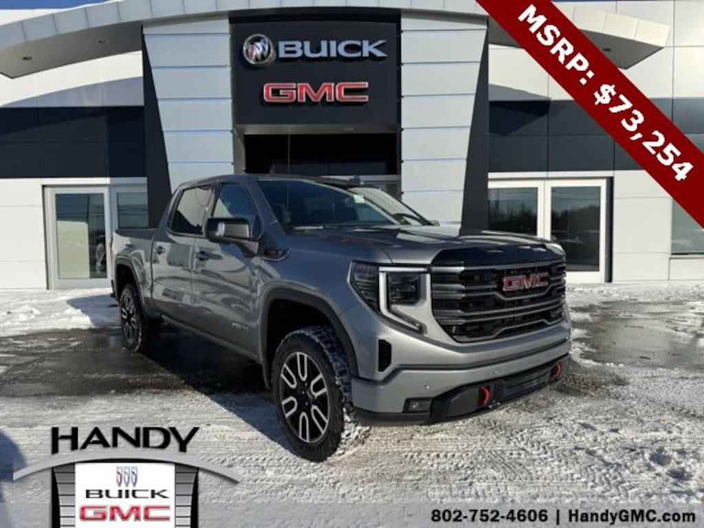 Priced below KBB Fair Purchase Price!10-Speed Automatic, 4WD, Jet Black With Kalahari Accents Leather, 120-Volt Bed Mounted Power Outlet, 120-Volt Interior Power Outlet, 2 Charge/Data USB Ports Inside Center Console, 2 Type-C Charge-Only Rear USB Ports, 2 USB Ports, 220 Amp Alternator, AT4 Preferred Package, AT4 Premium Package, Auto-Locking Rear Differential, Bed View Camera, Black Chrome Grille Insert Bars, Color-Keyed Carpeting Floor Covering, Deep-Tinted Glass, Electric Rear-Window Defogger, Floor-Mounted Center Console, Front Prem Floor Liners w/Removable Carpet Insert, Front Rain-Sensing Wipers, HD Surround Vision, Heated 2nd Row Outboard Seats, Heated Driver & Front Outboard Passenger Seating, Heavy-Duty Air Filter, Hill Descent Control, Hitch Guidance, Hitch View, In-Vehicle Trailering System App, Integrated Trailer Brake Controller, Keyless Open & Start, LED Cargo Area Lighting, Multicolor 15 Diagonal Head-Up Display, Navigation System, Off-Road High Clearance Step (LPO), OnStar Services Capable, Perimeter Lighting, Power Door Locks, Power Front Passenger Windows w/Express Up/Down, Power Front Windows w/Driver Express Up/Down, Power Rake & Telescoping Steering Column, Power Rear Windows w/Express Down, Power Sliding Rear Window w/Rear Defogger, Preferred Equipment Group 4SB, Premium Bose 7-Speaker Sound System, Push Button Start, Rear Camera Mirror, Rear Cross Traffic Braking, Rear Pedestrian Detection, Rear Prem Floor Liners w/Removable Carpet Insert, Rear Wheelhouse Liners, Red Recovery Hooks, Remote Vehicle Starter System, SiriusXM w/360L Trial Subscription, Spray-On Pickup Bedliner w/GMC Logo, Steering Wheel Audio Controls, Technology Package, Theft Deterrent System (Unauthorized Entry), Trailer Camera Provisions, Trailer Side Blind Zone Alert, Trailering Package, Ultrasonic Front & Rear Park Assist, Universal Home Remote, Ventilated Driver & Front Passenger Seats, Wi-Fi Hotspot Capable, Wireless Charging.Sterling Metallic 2026 GMC Sierra 1500 AT4 4D Crew Cab 4WD 10-Speed Automatic EcoTec3 6.2L V8Contact Handy Buick GMC for details on this vehicle today! Reach out to us at 802-524-4615, speak with one of our customer friendly purchase and leasing consultants to schedule the test drive of your next NEW or PRE-OWNED vehicle! Please Note: New vehicles marked as In Transit and other recent additions to our inventory may not show all available rebates, discounts and incentives. Price includes: $1750 - Purchase Allowance. Exp. 02/02/2026 $3500 - Trade Assistance. Exp. 02/02/2026 $500 - Bonus Cash. Exp. 02/02/2026 $1,000 - Exp. 02/02/2026 Must finance standard rate financing with GMF. Amount financed and term varies depending on vehicle.